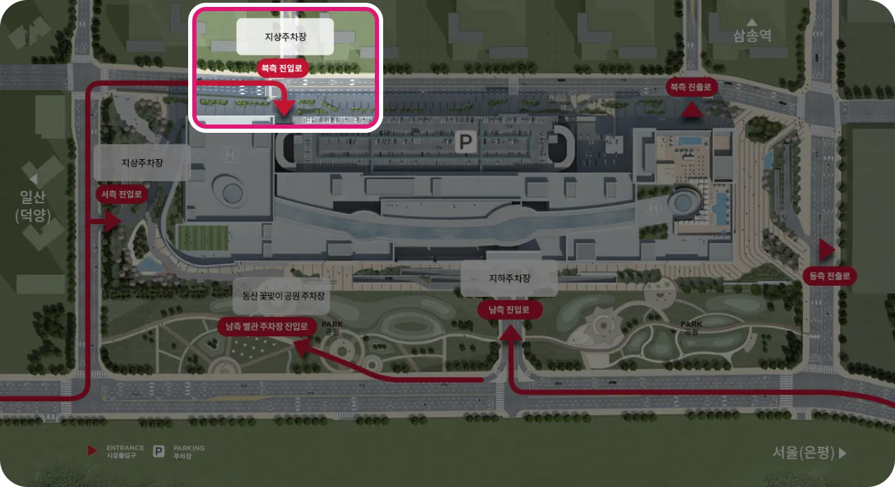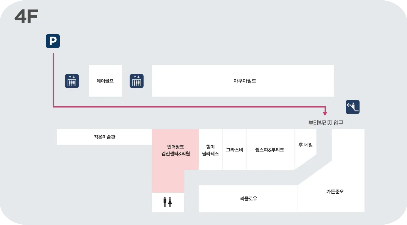 북측 진입로 진입 및 4층 3번홀 인근에 주차 후 뷰티빌리지 이동