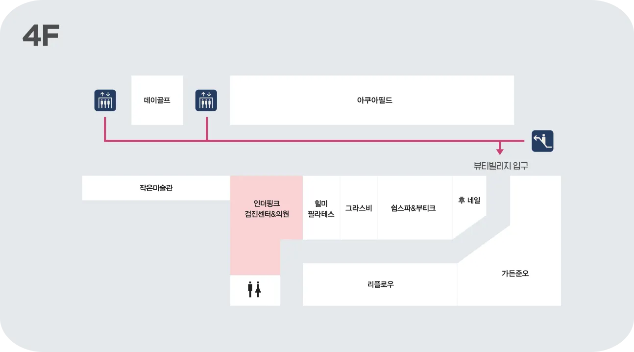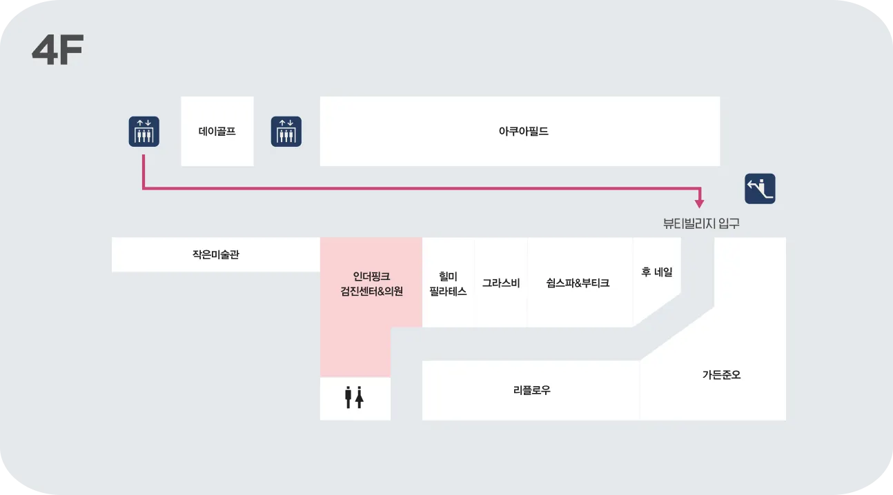 3번홀로 진입 및 엘리베이터 이용 4층 하차 후 뷰티빌리지 이동